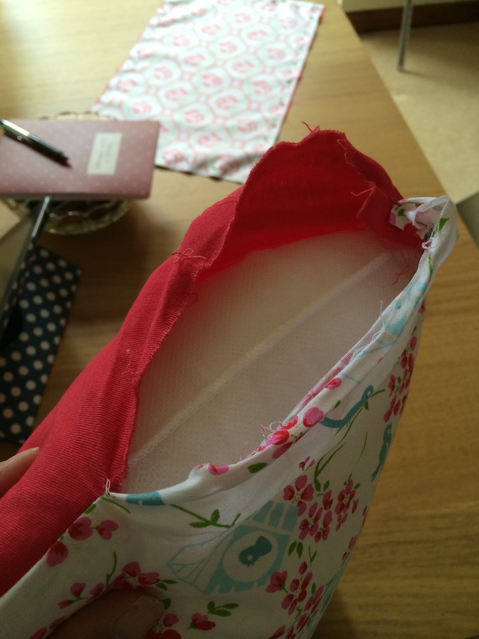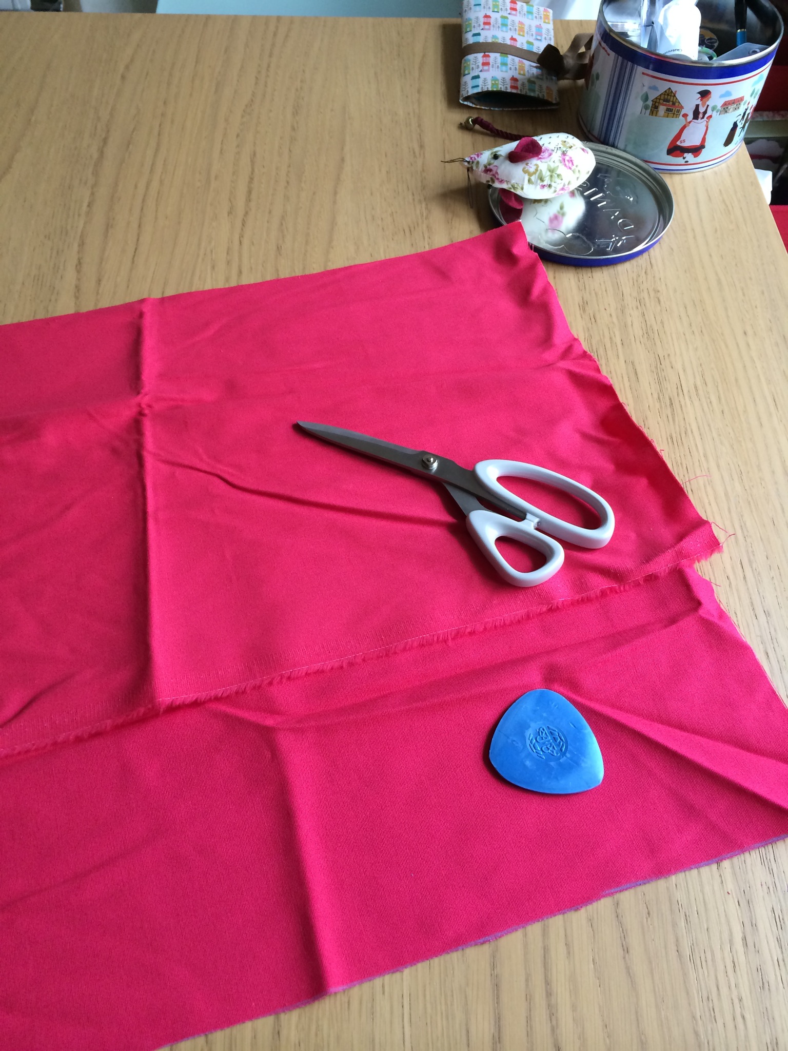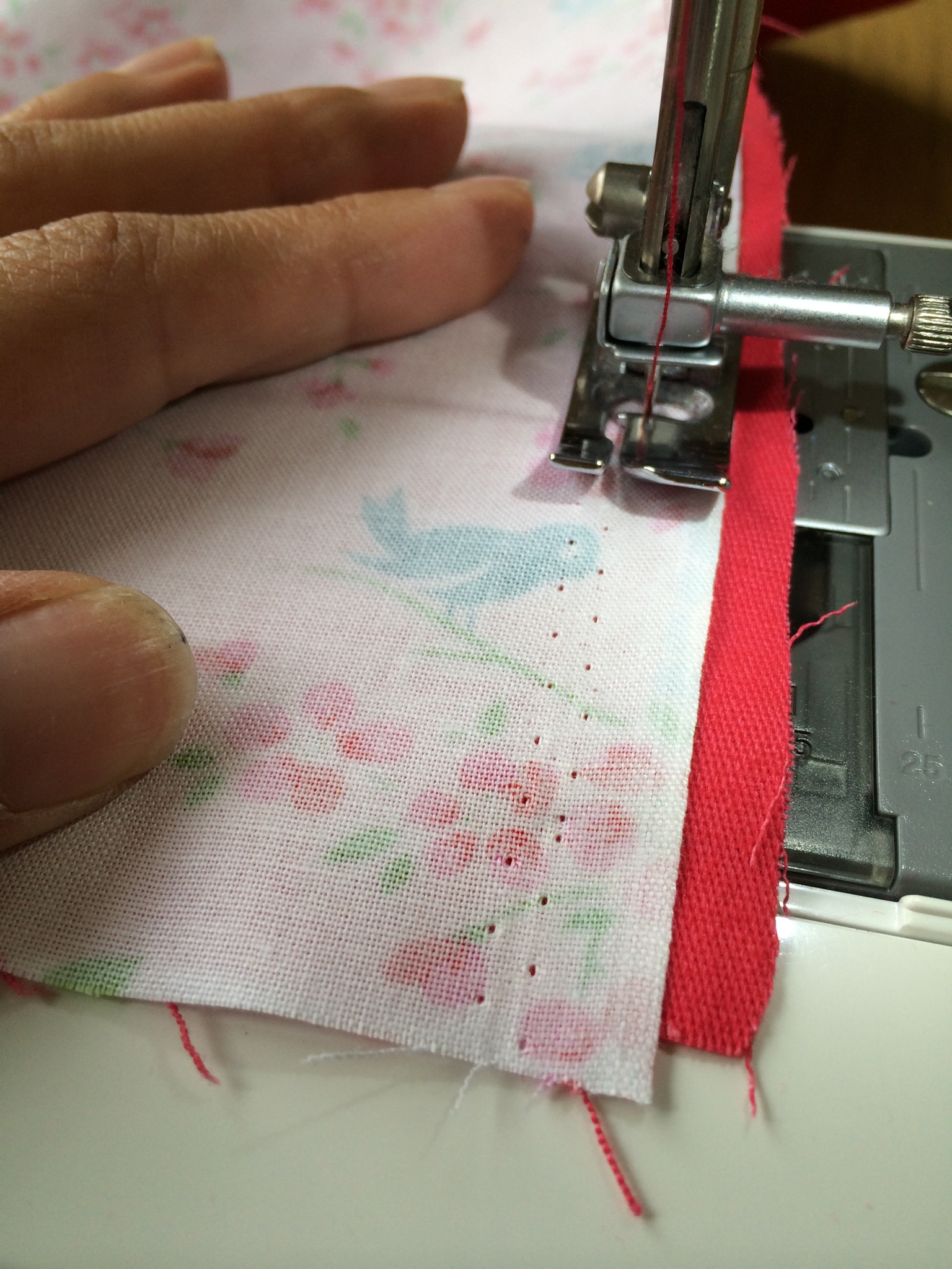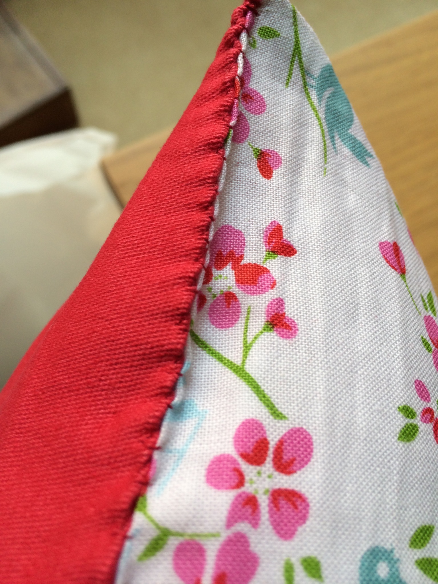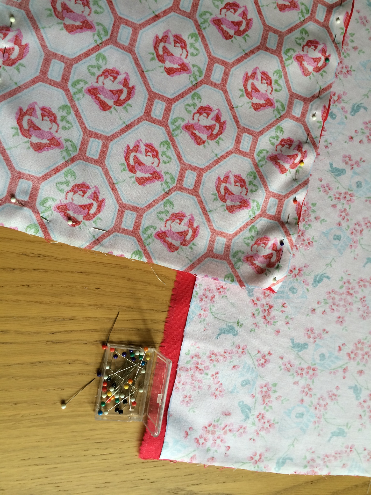 First I measured the cushion pads, which I’d spotted at a bargain £2 when I bought the fabric – I got all 6 pads available. I added 2cm to each length as seam allowance. For the back, to contrast with the Cath Kidston-esque fabrics, I used some pink fabric that is slightly stretchy and left over from a previous apron project.