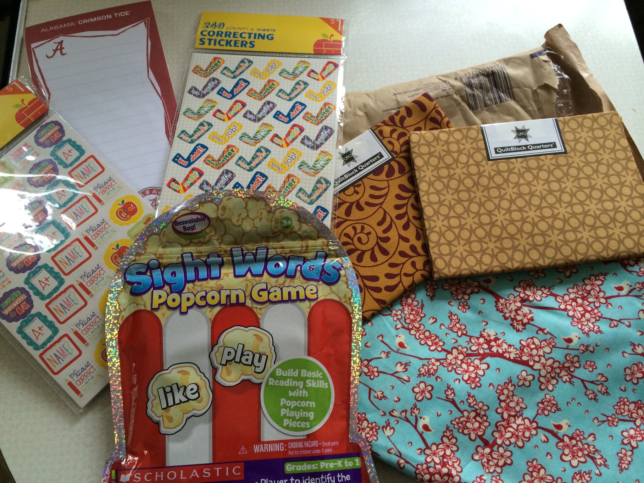 After my first day back in school, and before the return of my class tomorrow, today I came home to a rectangular surprise. Fortunately wrestled from the teeth of the dogs in time to prevent destruction, I recognised the handwriting immediately: that of my friend who has just relocated stateside. Inside were lots of lovely treats! Some for Making, some for Marking! Beautiful fabrics, stationery and even a spelling game! I was thrilled and am already considering what I can send in return. As well as continuing our trans-Atlantic friendship, I think that this could also be the beginning of a beautiful (fabric- swapping) relationship ❤️