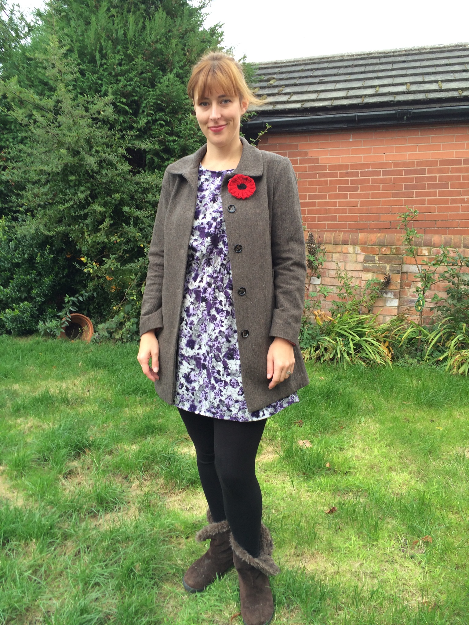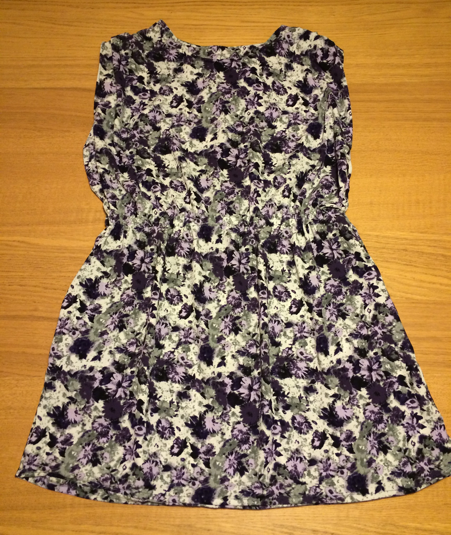 I made and stitched on the pockets, and then hemmed along both sides and around the edges of the pockets, which I liked. To make the waist band the instructions said to use bias binging as a casing, which I didn’t have, so instead a used a pinked strip of fabric and sewed both sides to create a tube, leaving a gap to insert the elastic. I somehow remembered to use a safety pin as a method of pushing through the elastic, but probably as I was getting tired, this took three attempts before I could bind the ends together and close the gap. Lastly I tried the dress on and checked the length: mid calf, much too long. I measures up and cut a whopping 25cm, whilst trying to maintain the slight curve of the hem. To finish I turned up about a cm, sewed, turned it up again and re-sewed. I am not sure if it’s due to the trimming, fabric, finishing or something else, but the completed dress doesn’t drape very nicely and hangs quite straight. My first attempt at the 2014 Vintage Pattern Sewing Pledge. Four more to go before the end of December!