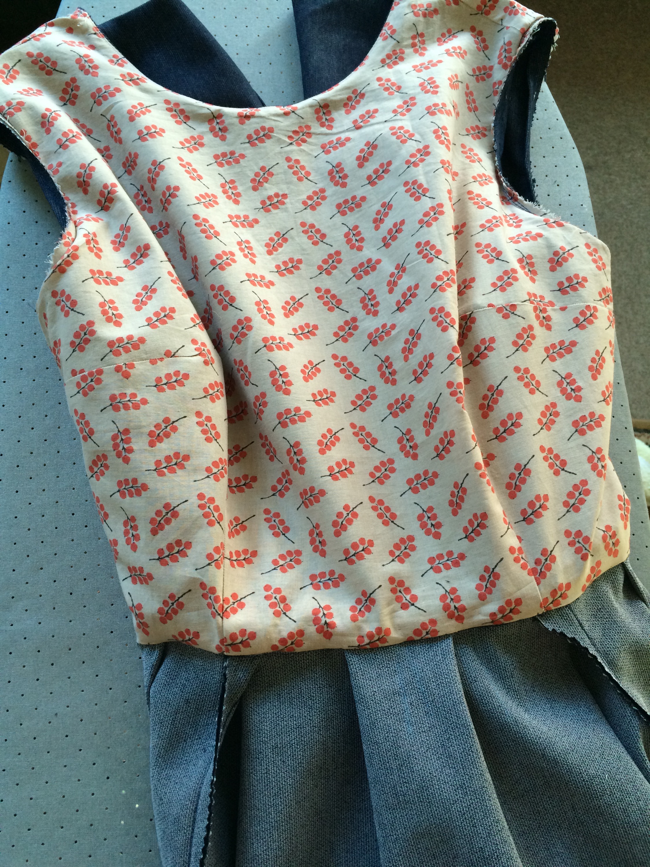 I left the dress for the night to mull over the options. Leaving the sleeves on really wasn’t an option, they stuck out and massively overpowered the dress. So it was a choice between trying to alter the (painstakingly) lined sleeves, or unpicking and removing them altogether. None of the options was appealing, but I knew I had to do whatever would render the dress wearable. The next morning I grudgingly removed the sleeves. The pattern included a view that was in fact sleeveless, but as that hadn’t been my intention I had already gone too far, as it were to change this dress to that one. Instead, I felt my only choice was to try and turn under the raw edges and then top stitch, which was annoying as all of the other sections were finished in different, neater ways. A single row of top stitching left the wrong side still trying to twist around, but a second row seemed to secure it.