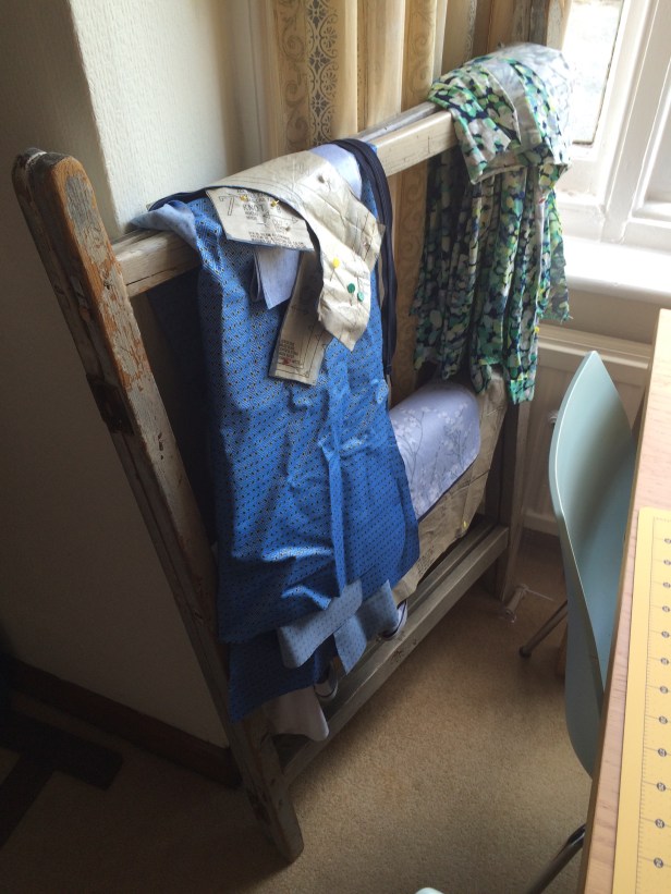 Inside I spotted some pretty postcards, set in frames that were completely wrong but that didn’t detract from their appeal. I found one set of three, then another. As I went to the cashpoint my mum found an inscribed cigarette tin that had the look of prisoner of war art. I’d also glanced at an old and shabby clothes airer. After a little bartering, I handed over £30 for the sewing box, the 2 sets of framed cards and the airer, swiftly followed by another £2 for the cigarette tin. A very fair price, I felt. I quickly put the airer to use in my sewing room, as a way of storing my WIPs rather than piling them on a dining chair.