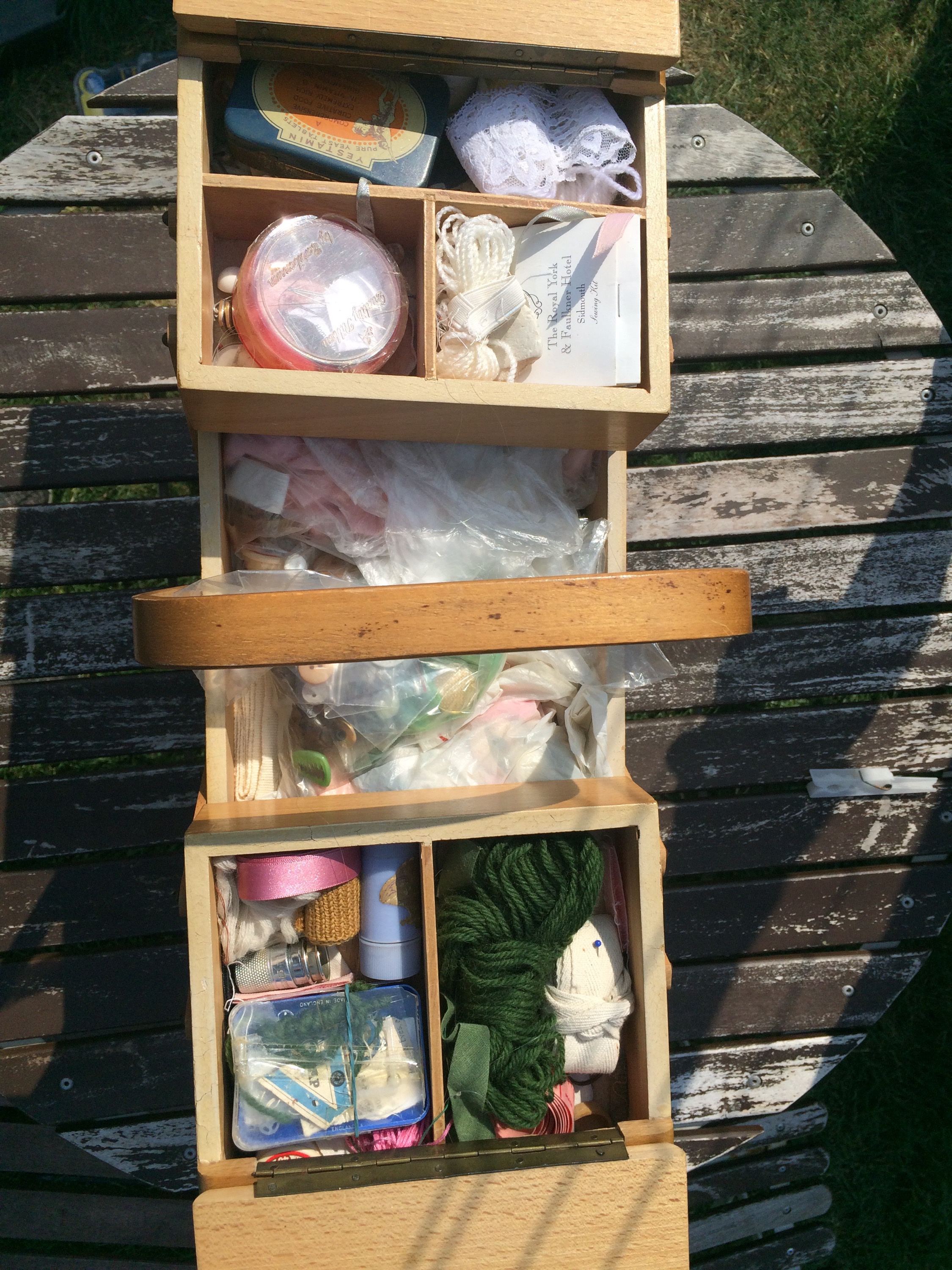 The wooden sewing box was the first thing I spotted. As I began to open the compartments I saw the contents were still intact. The lady from the sho ventured outside and advised me it would be £10 for the sewing box, and a further £3 if I wanted the bag of knitting needles and patterns beside it.