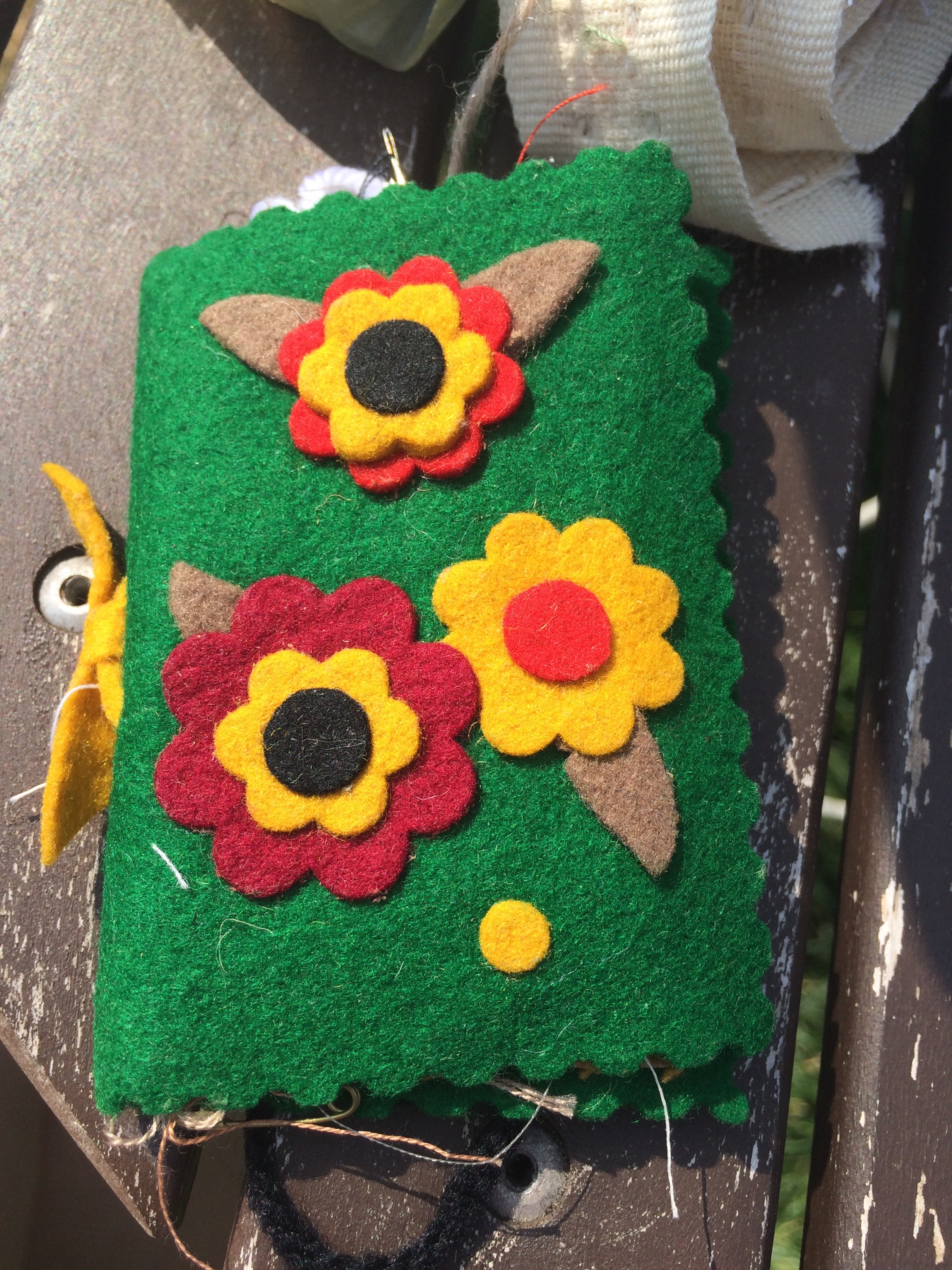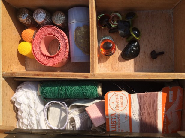 The box was full – jam packed. Threads, fabrics, tools and equipment, odds and ends, spare buttons and scraps of cloth and ribbon. A collection of inexpensive items accumulated over many years.