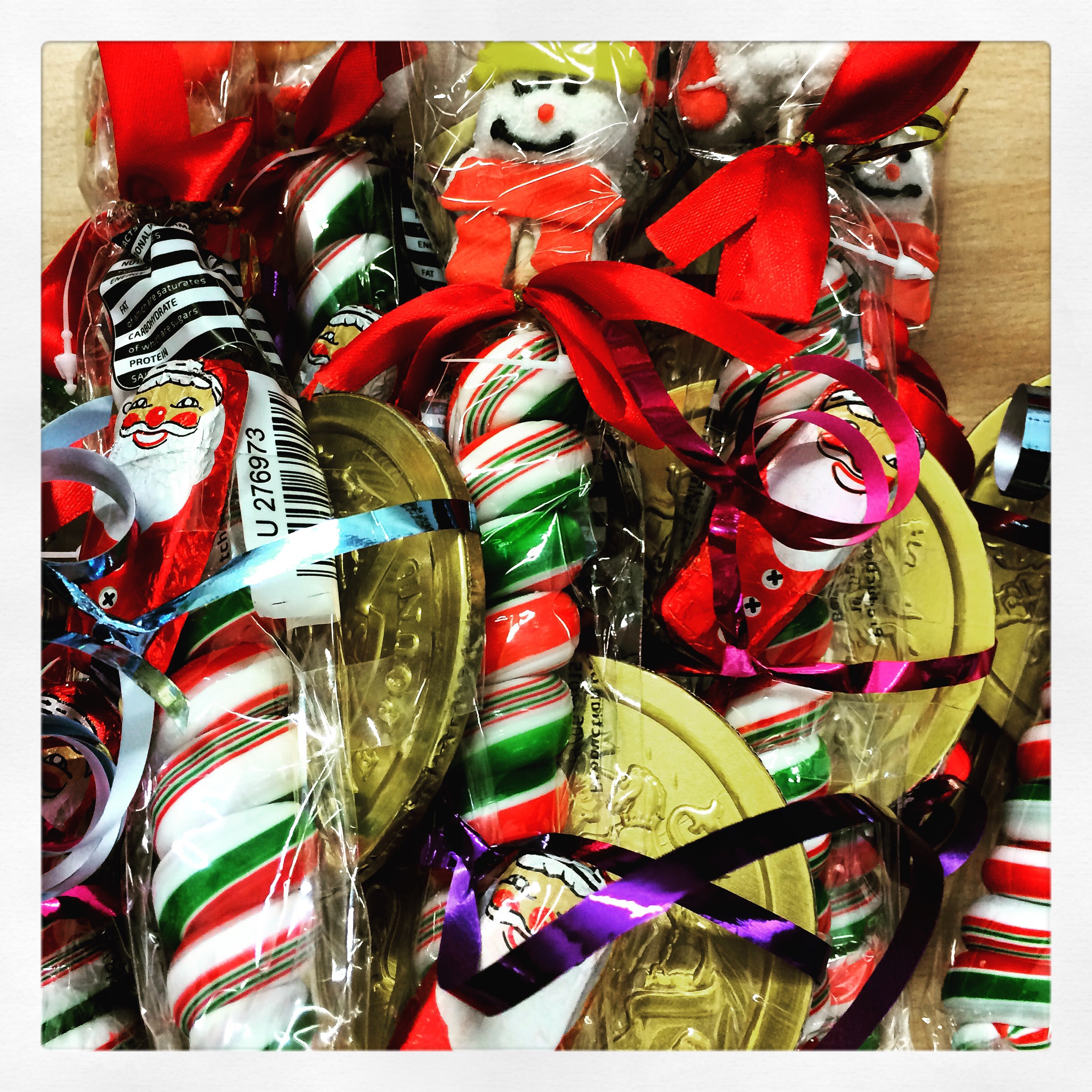 1. Often I’ll buy Christmas presents for next year’s class in the Christmas sales, but last year there was slim pickings. Instead I bought these candy cane type lollipops, giant chocolate coins and foil-wrapped Santas. With sellotape and a little ribbon we made a small gift for each child to take home on the last day.