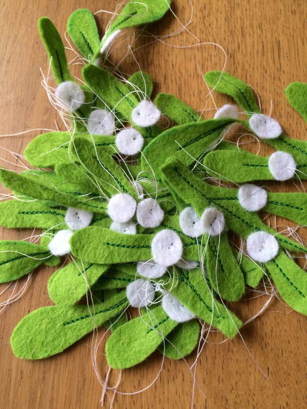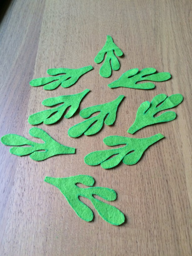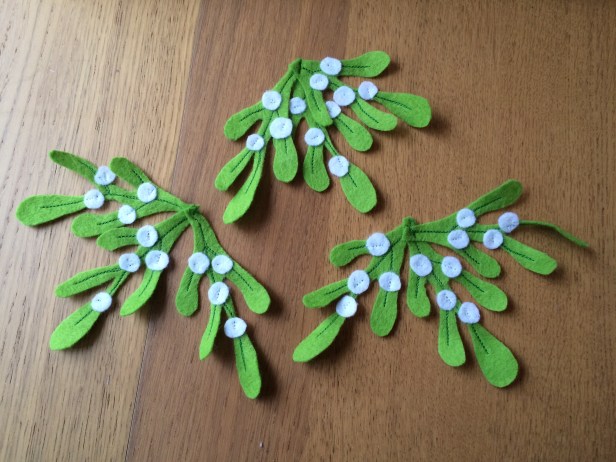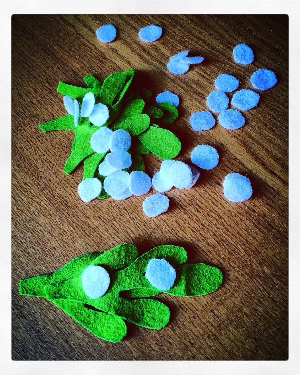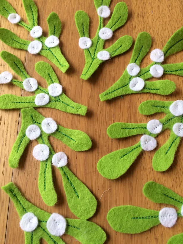I started off by printing out the mistletoe template, and cutting the 9 sprigs from a square of felt.