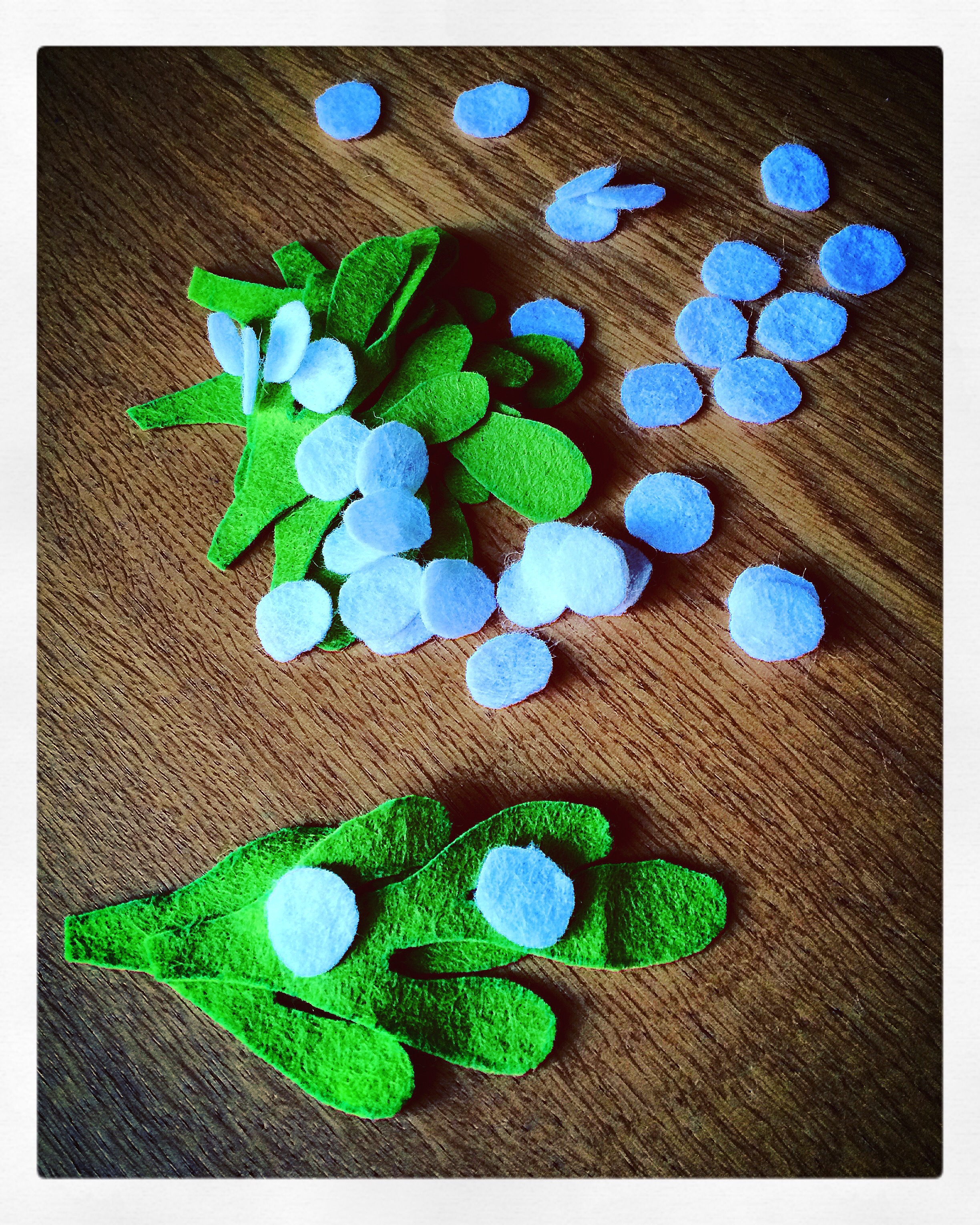 I then cut out the circles of white to make the berries, but had to return to these later as I’d cut them almost double the requisite size.