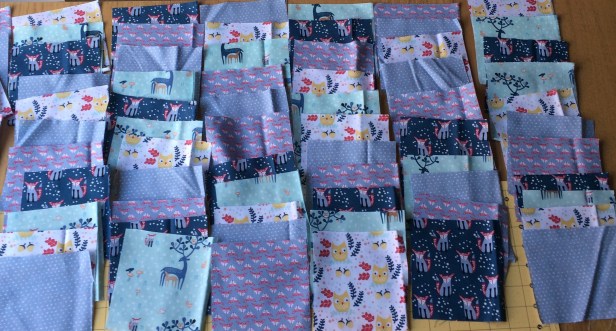 I cut the fat quarters into 5″x 5″ squares, which left only 2 narrow strips of waste. I didn’t place them in a particular order but made sure two matching squares didn’t touch. I ended up with with a quilt that was seven 5″ squares wide and eleven 5″ squares long – fairly random I know but the approximate shape and size I wanted.