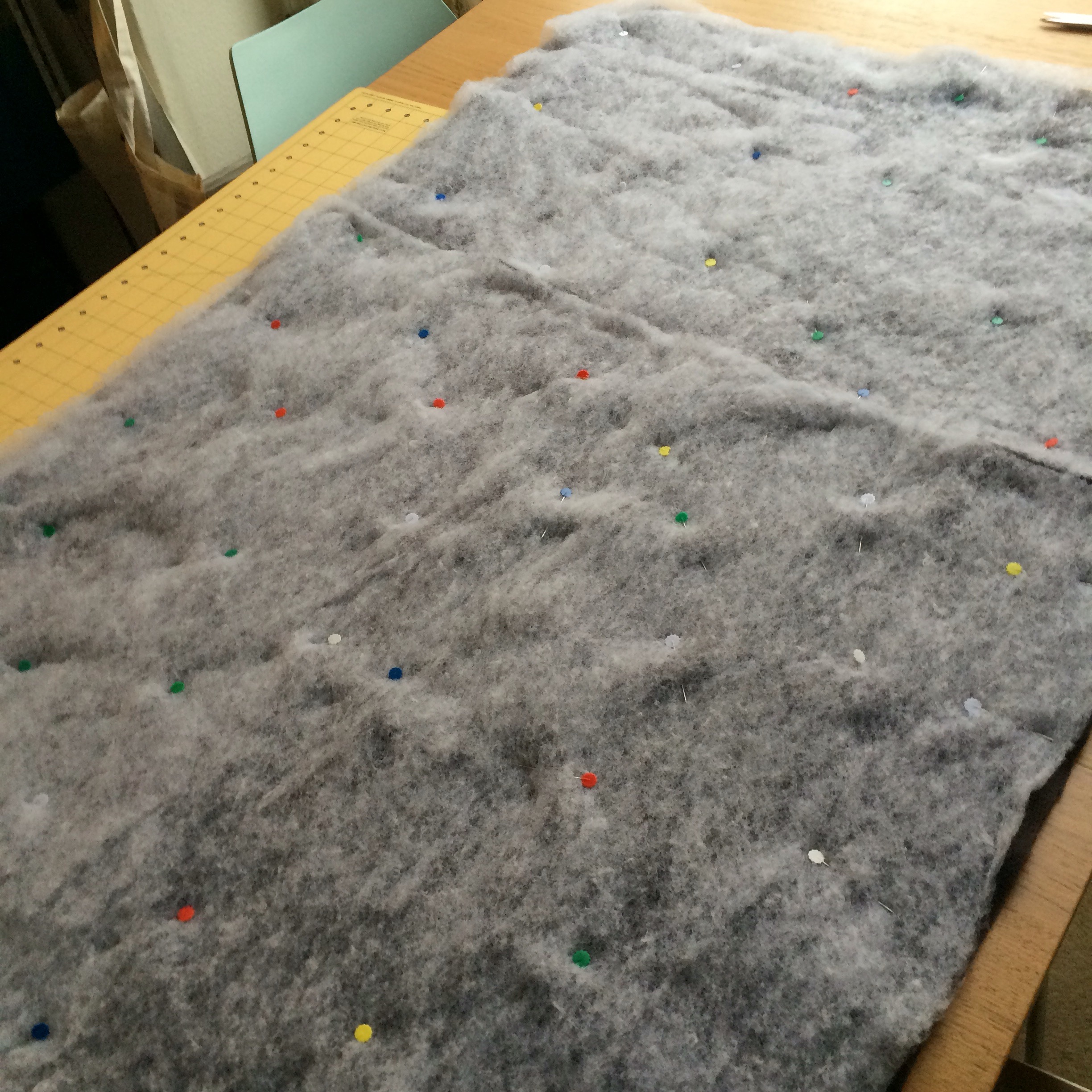 Next I laid the topper over the wadding and then the fleece, and cut around the edge so they were the same size. I pinned from the inside out, and placed many pins, which I think helped the quilt to stay much straighter than my previous ones.
