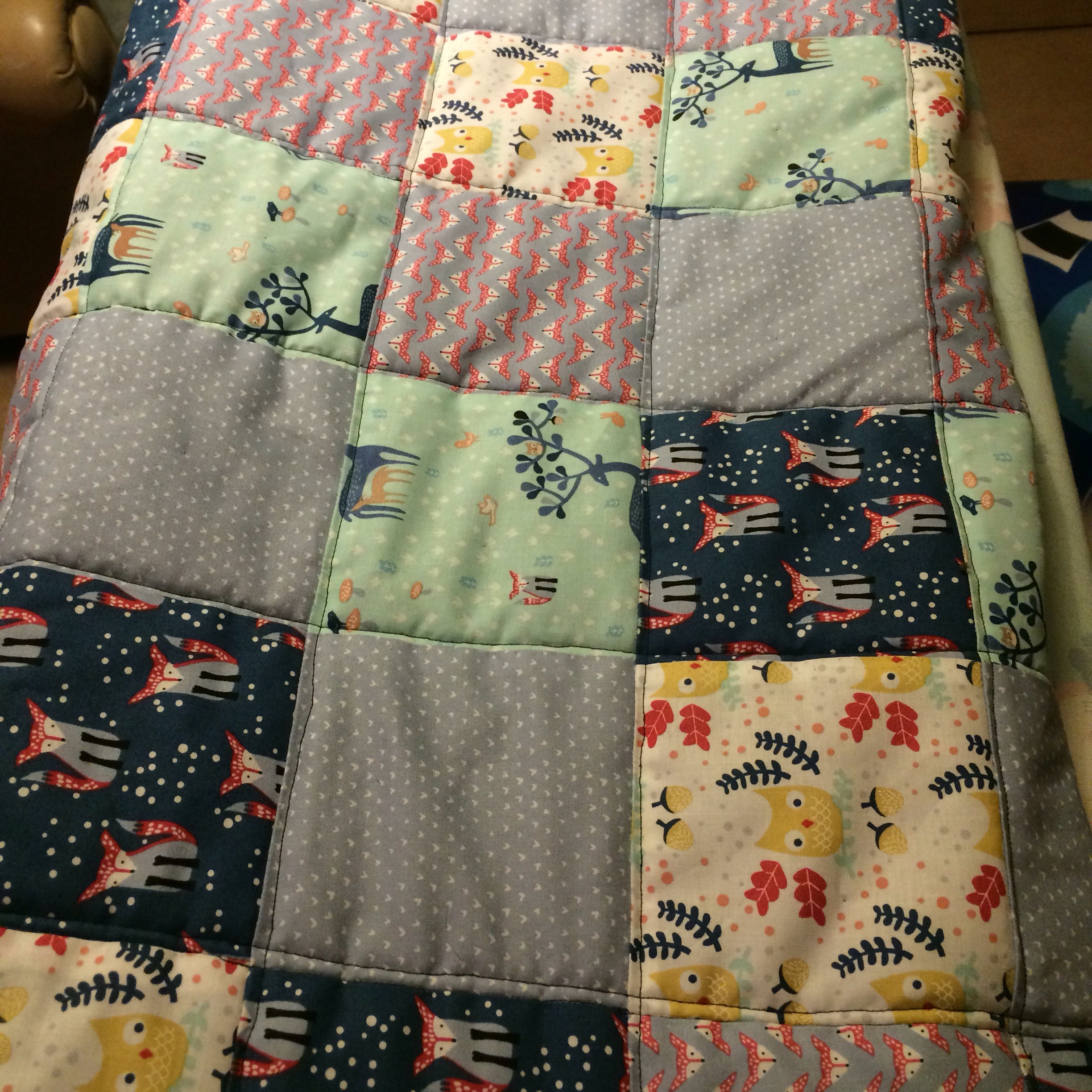 After quilting along the horizontal and diagonal seams, I realised I should have sewn 1/4″ all around the edge first – this would have made it easier as I wouldn’t have tried to sew the lines of quilting stitches right to the edge of the quilt. One to remember for next time. Pretty quickly, however, the quilt was complete.