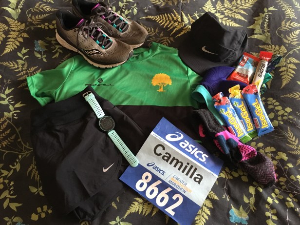 As the week progressed I was cautious about every move I made – what I ate, how much I walked/ran, how much sleep I was getting. I checked the weather for Manchester several times a day, which went from sunny and 15 degrees to rainy and 11, finally settling on 10-12 degrees and cloudy. I knew from Hull full sun was the last thing I wanted, so was pleased when the sunshine was replaced by rain clouds. I decided to run in shorts, which I had trialled at Hull, plus my compression socks that I had grown to love and rely on over the winter. Rather than my club vest and t-shirt/long sleeved top, I’d purchased a short sleeved club tshirt and, whilst I had worn it only once, was confident this would be comfortable enough to get me through 26 miles. I’ve had tops previously that have rubbed in all kinds of areas, which is enough to drive you to distraction on long distances. Finally, I had to consider how to carry my gels and phone. How many gels? Would the ones provided on the course be ok? What if I had too many and had stomach troubles? Did I mention that training for a marathon is far from glamorous?