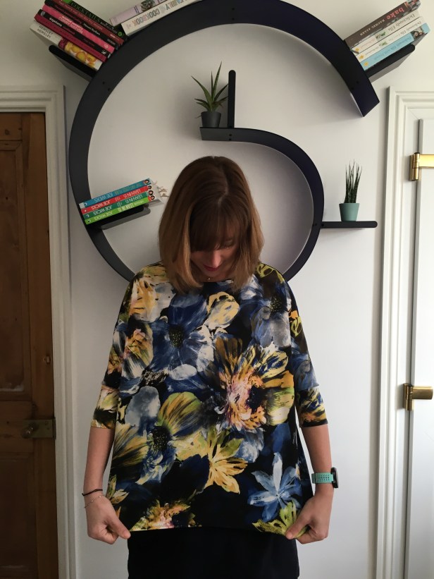 The fabric is some Fabworks border print scuba leftover from an unsuccessful Freya which found a new home through eBay. I didn’t actually love this fabric when the Freya was made up (though the main issue was lack of cross-wise stretch with how I’d used the border). This time however I was pleased to be able to make the front and the sleeves from the gorgeous oversized floral print and the back in the more abstract design.