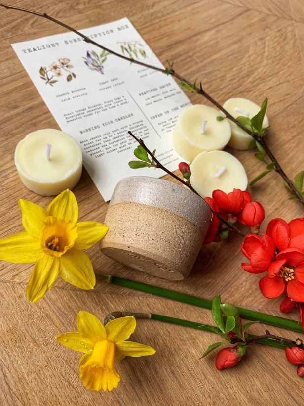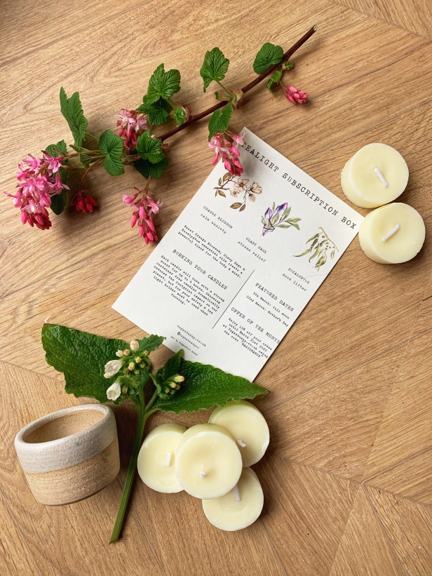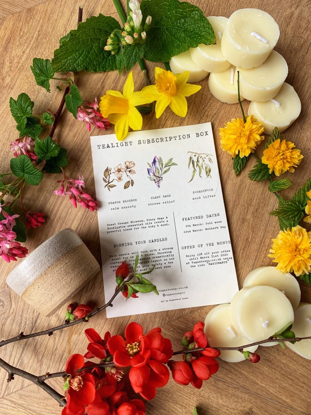 Last month I was lucky enough to be asked by Vegan Bunny to review the first box in their brand new zero-waste tealight subscription. Last year I  discovered this small family-run business, thanks to an Instagram post by Joy over at Pink Coat Club, and I will be honest, prior to that I had never given much thought to the origins or impact of the candles I bought. So far I have found all of the products I have purchased to be ethically produced and packaged, carefully chosen and gorgeously scented. The customer service is also superb. When I read about the launch of the tealight subscription I actually requested it as one of my birthday gifts, because I knew it was something I would look forward to and enjoy each month.So what does this month’s box contain? Inside the first box there is are twelve tealights, a tealight holder and an information card. The card details the plants and scents used to make this month’s candles – as with allVegan Bunny products these are natural and in no way fake or chemically. There are instructions on how to safely burn the candles and two featured dates in March. Finally, there is an offer of the month – which for March is a 15% off voucher code (though if you are quick there is actually 25% off everything over on the site at present!). This is all printed on beautiful quality card and features three pretty and delicate illustrations of the plants and herbs, including what they are they used to alleviate (anxiety, stress and also to lift mood).Most often I enjoy burning a candle whilst I am sewing; it definitely instills a calming and almost therapeutic element to my making. To make sure my review was as thorough as possible, I burned my first March tealight last night. After just a few minutes the scent began to fill the room, and it was just delicious. Not overpowering, but delicate and natural. I found it to be quite a cleansing and fresh smell which is quite invigorating: I love it.This month’s box includes a small pottery tealight holder. It is plain and simple and accommodates each tealight nicely. The tealight I burned lasted throughout the evening (well over 4 hours) and this morning I was able to remove the remainder easily from the holder. I know from the Vegan Bunny candles I have purchased previously, if they are stuck more firmly, simply using water from the hot tap makes the tins easy to clean (I rarely find this to be the case with ‘normal’ candles, which I think must be due to all the chemicals and nasties they contain!).Although I am not vegan, I don’t eat meat and animal welfare and sustainability are both extremely important to me. To find a subscription to just about anything that is ethically and environmentally sound is pretty rare, I think, and it’s wonderful that not only is the packaging is plastic-free but also a tree is planted for every subscriber. I adore all plants and nature, and I enjoyed exploring and collecting some of the blossoms and bulbs that have appeared in my garden in March, which seemed like perfect accompaniments to these beautiful tealights.This subscription box comes highly recommended – I can already think of a list of friends and family who I think would love it as much as I do. In the current climate it’s important to me to support small businesses and these candles are a gorgeous treat that I will look forward to receiving every month. Let me know if you subscribe – either on your own or someone else’s behalf. Thank you so much Vegan Bunny – I already can’t wait to see what April will bring!